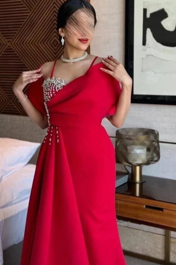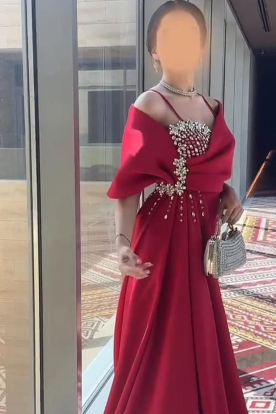 فستان سهرة أنيق بلون أحمر كرزي عميق، يتميز بقصة ملكية فاخرة تُبرز الأنوثة والرقي. الجزء العلوي مزدان بتطريز فاخر من اللؤلؤ والكريستال بشكل غير متماثل ينساب من الكتف إلى الخصر، ما يمنح الفستان لمسة درامية راقية.