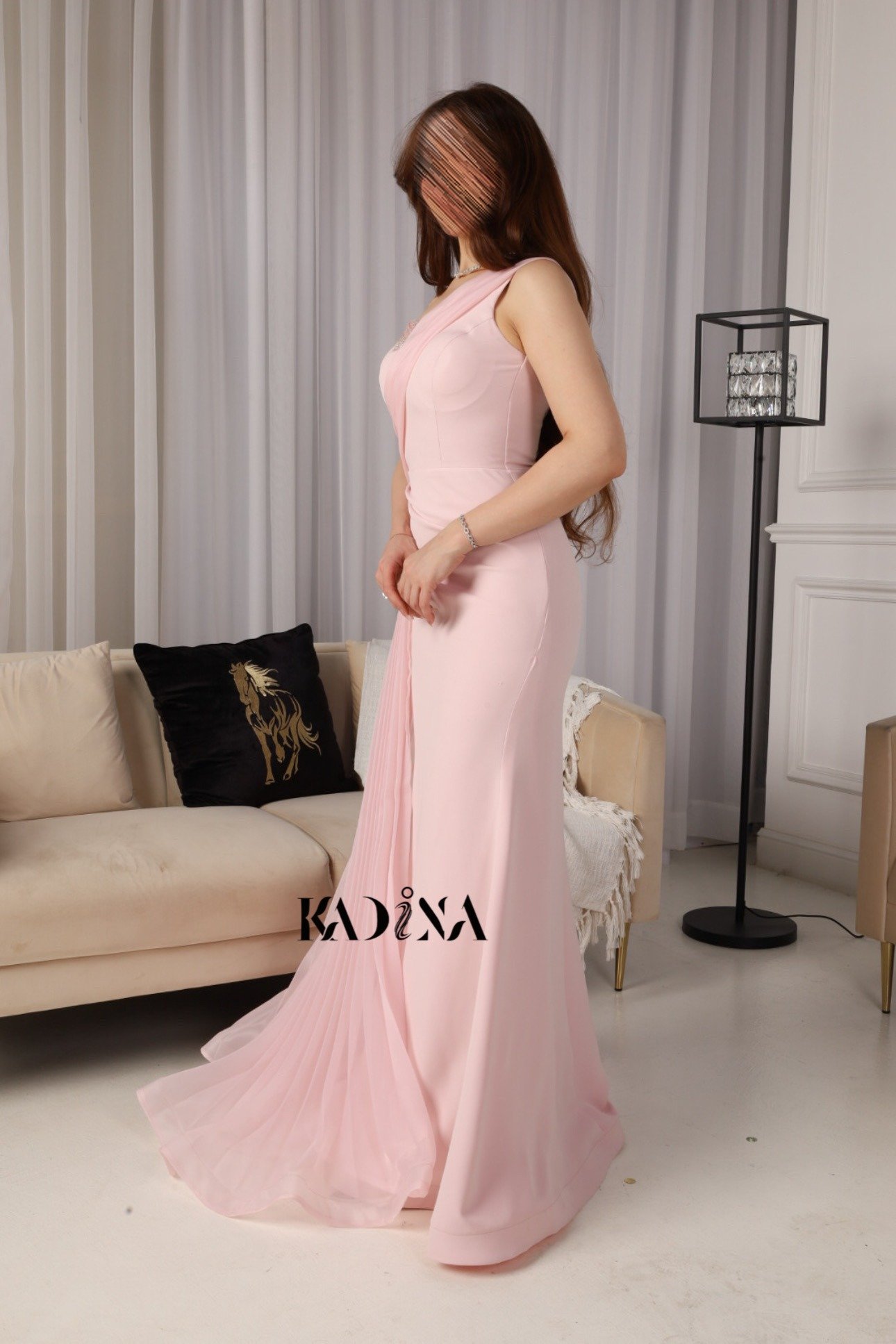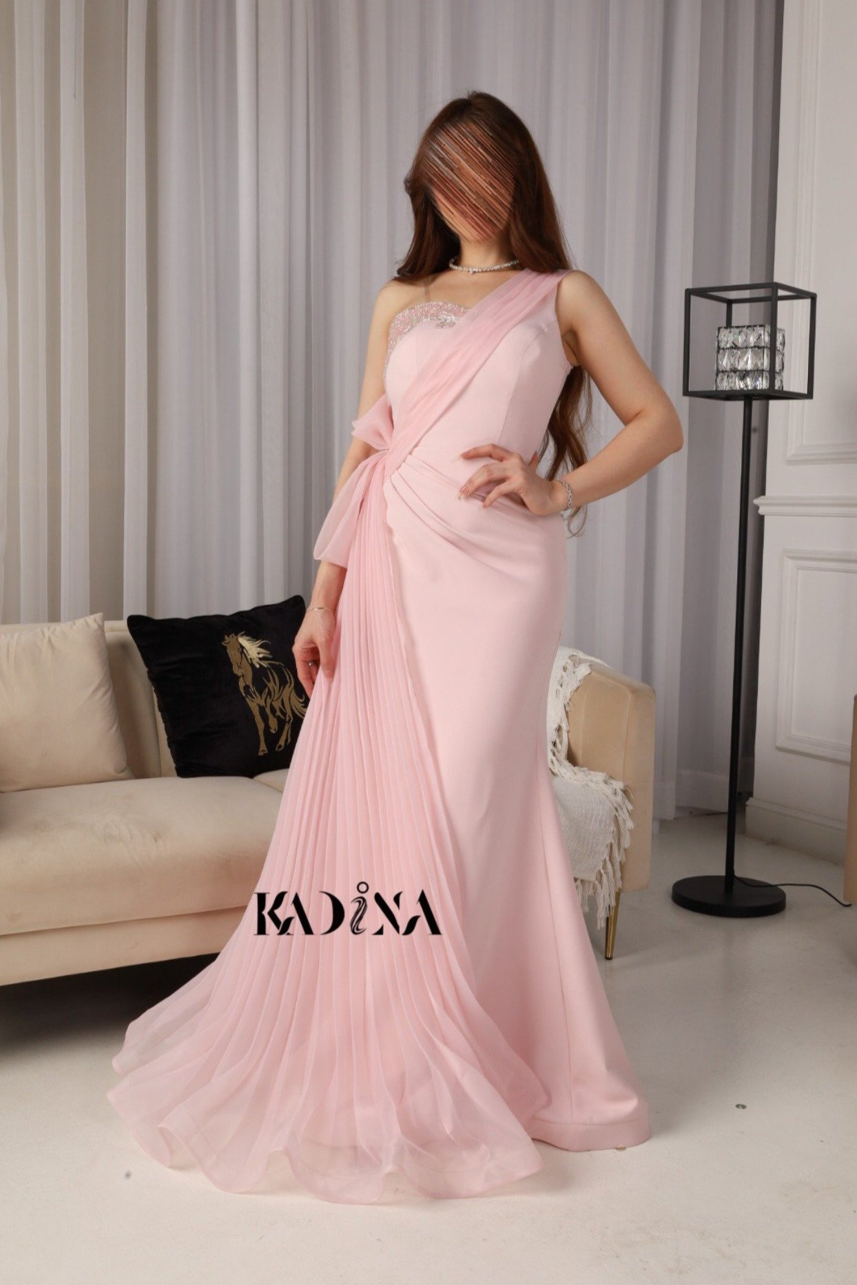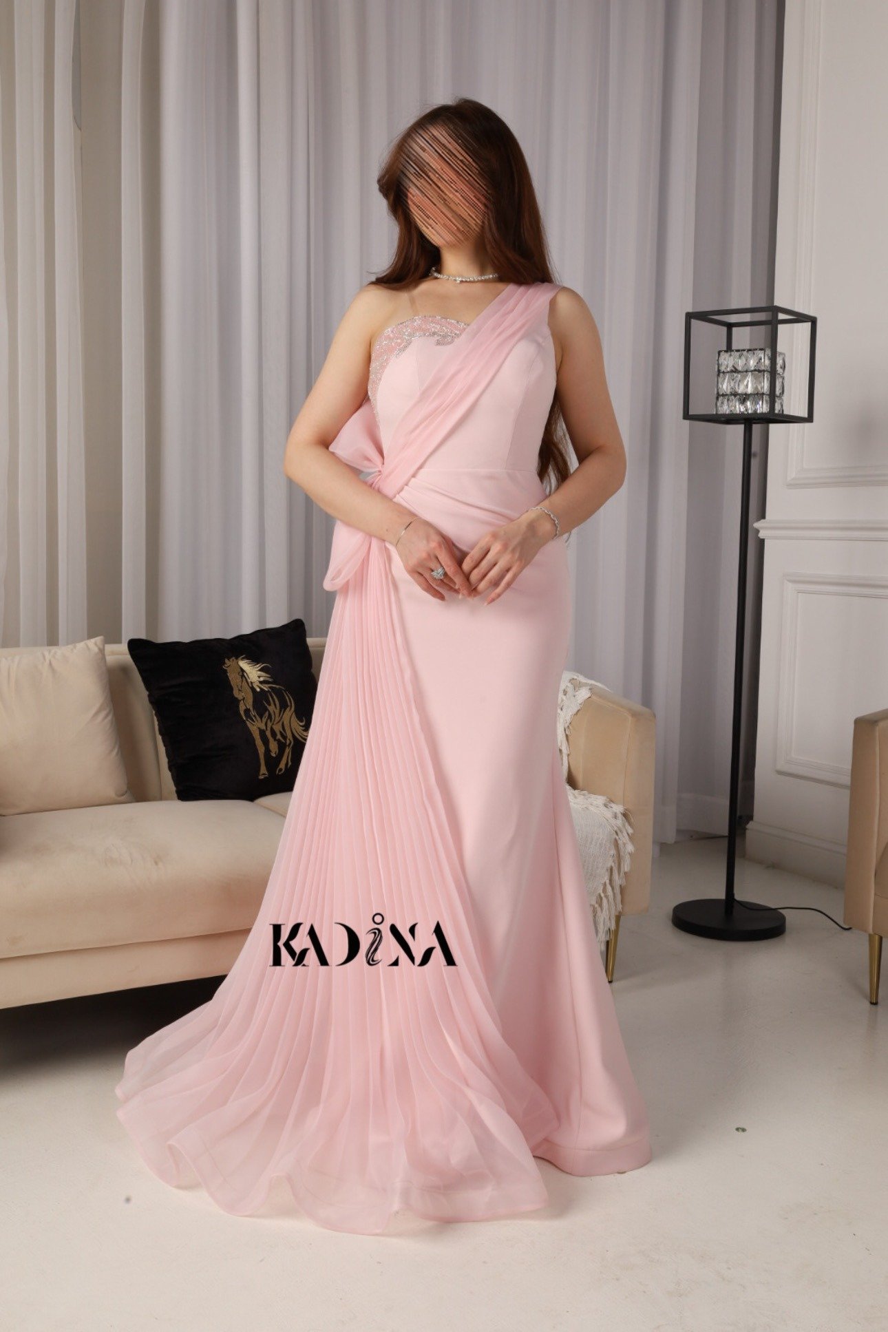 فستان سهره أنيق بلون وردي فاتح بلمسة ناعمة وأنثوية، يتميز بتصميم كلوش من الأسفل وقصة غير متناظرة على الكتف الواحد، مع شريط طويل من الشيفون المطوي ينسدل بانسيابية على طول الفستان ليضيف لمسة ملكية جذابة. الصدر مزين بتطريز ناعم لامع يعكس الضوء برقة، ويبرز الفستان القوام بأناقة دون مبالغة، مما يجعله اختيارًا مثاليًا للمناسبات الفاخرة.