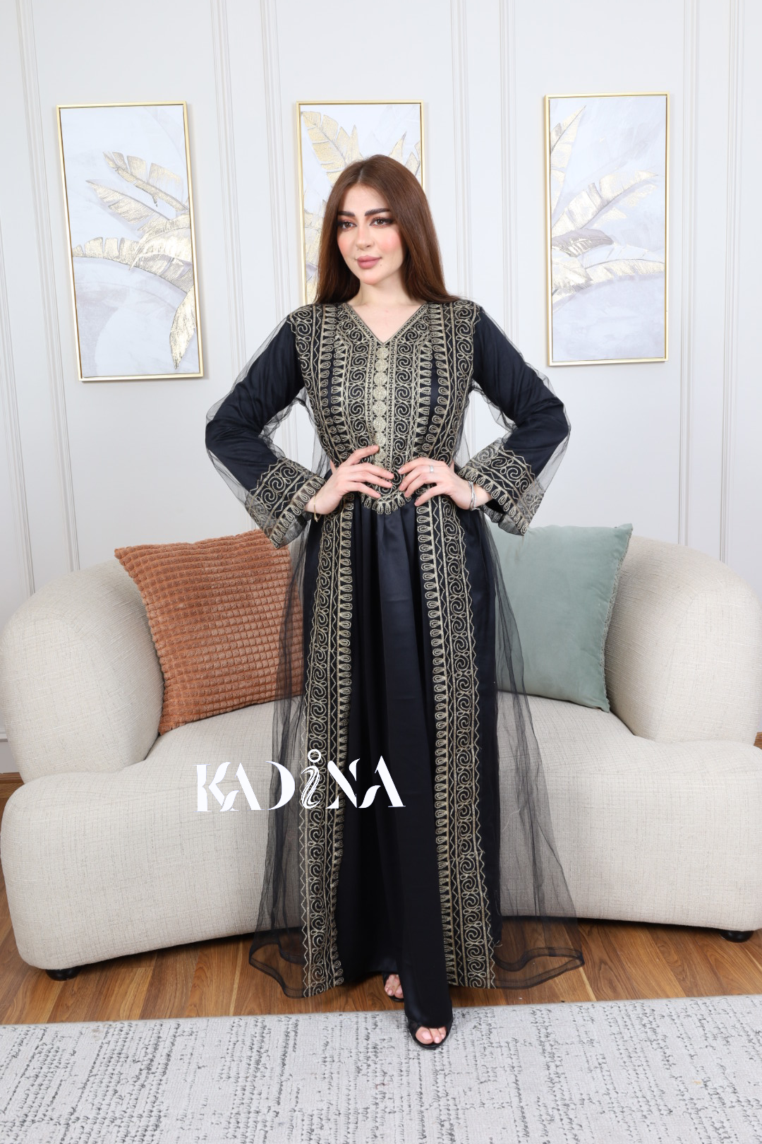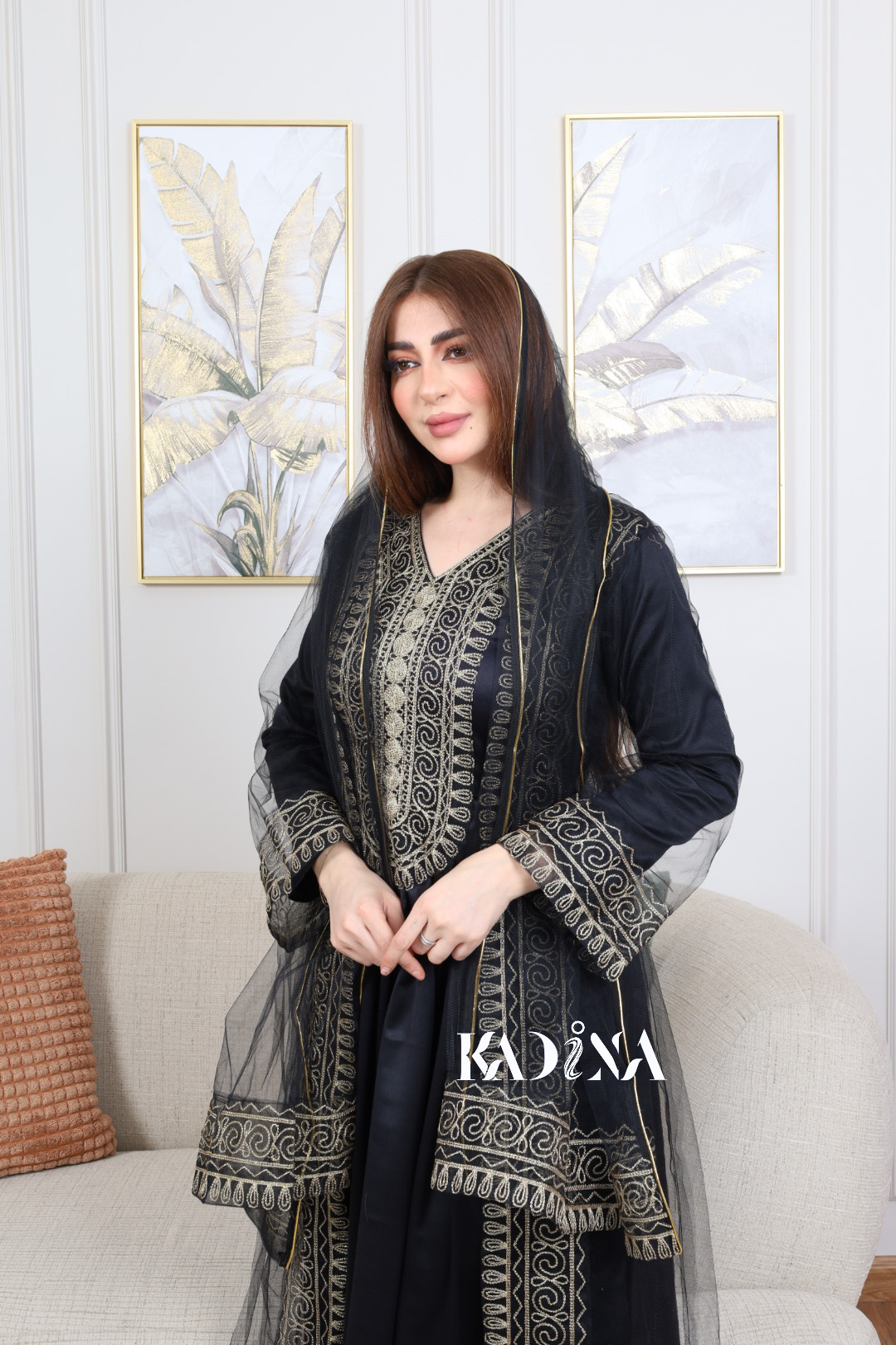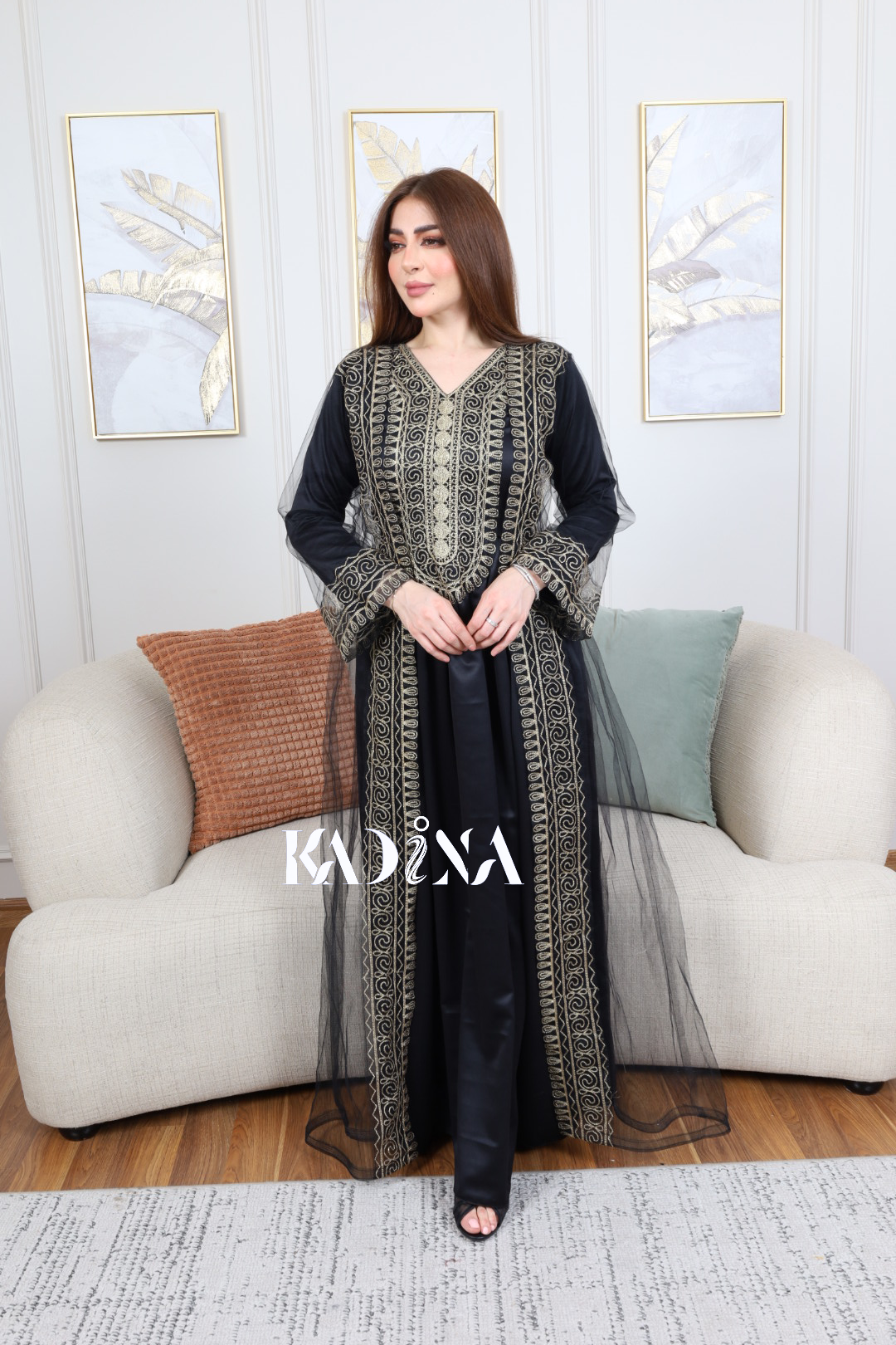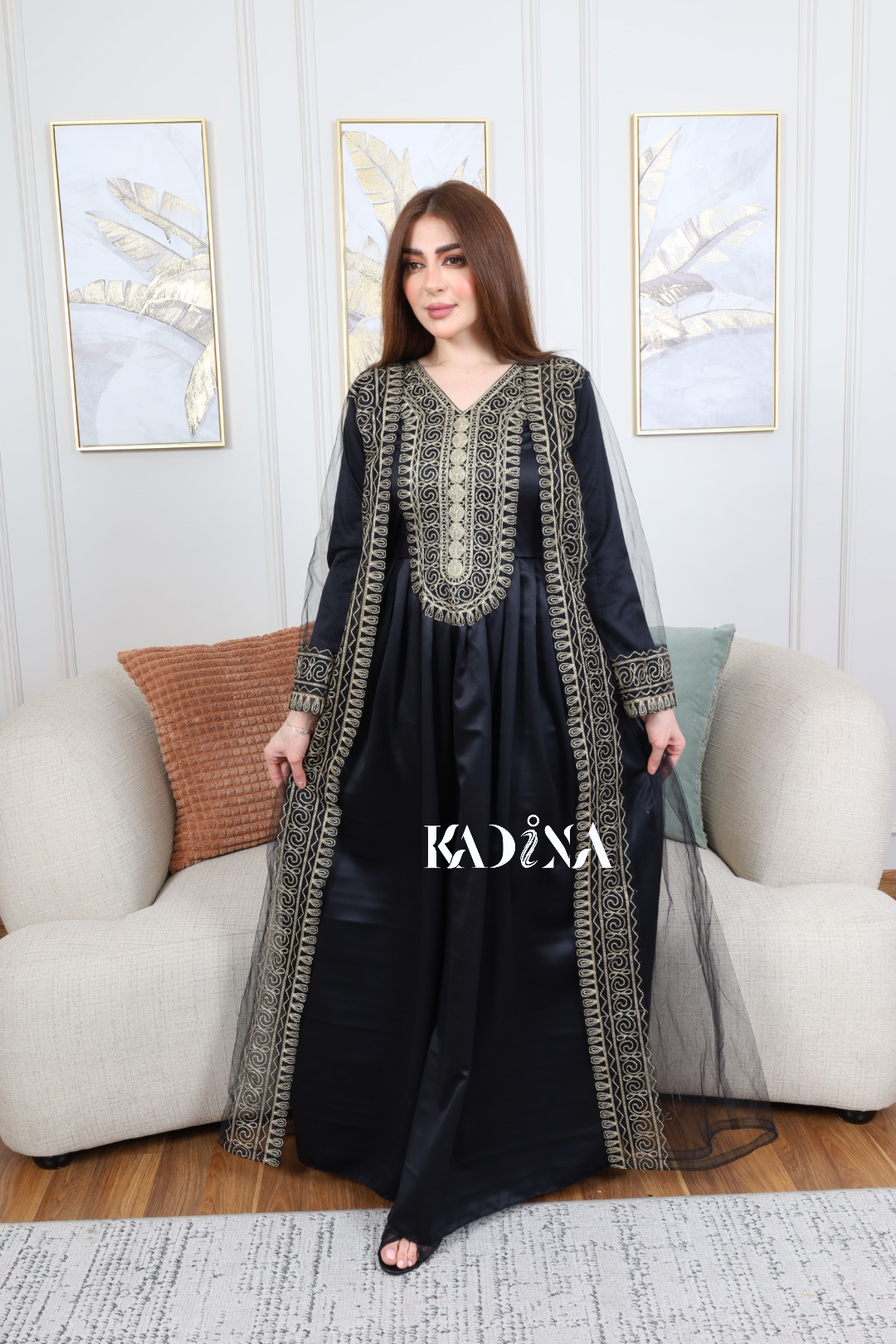 جلابيه سوداء بتصميم دقيق يأتي التصميم بقصة انيقة مزين بقصة الصدر والخصر الرائعه ، ما يعطي طابعاً من الفاخمة والجاذبية.