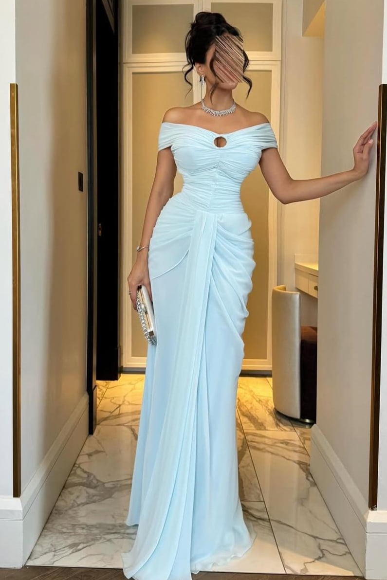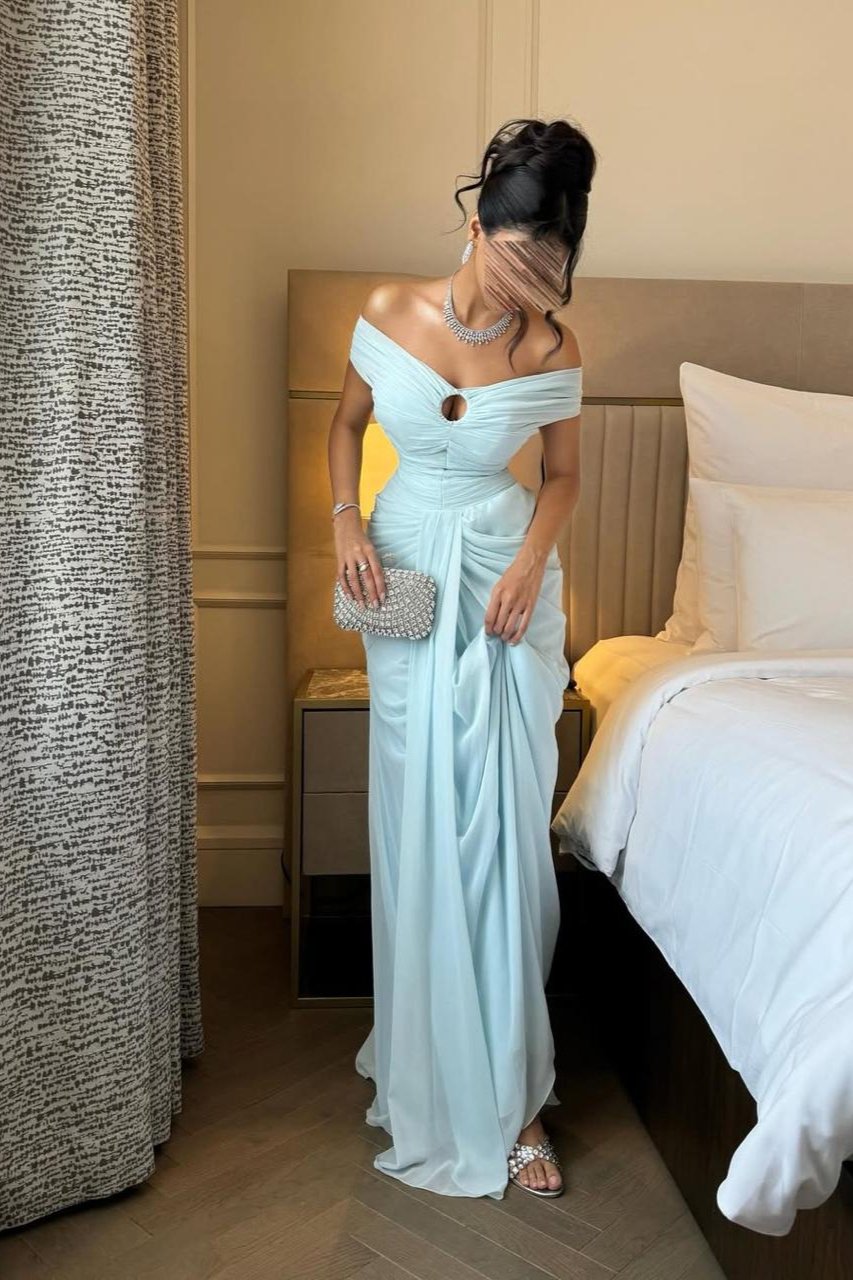 فستان طويل بلون أزرق سماوي ناعم يعكس الرقي والهدوء، مصمم بقصة ضيقة تبرز قوام الجسم بانسيابية. الجزء العلوي مزدان بكسرات طولية أنيقة مع فتحة دائرية صغيرة عند الصدر تضيف لمسة أنثوية جريئة. يتميز بأكتاف منسدلة على شكل أوف شولدر بلمسة كسرات راقية، مما يمنحه مظهراً حالماً. الخصر مشدود لإبراز الانحناءات، بينما يتدلى من الأمام قماش إضافي بشكل شلال بسيط يضفي انسيابية وحركة راقية على التصميم. الفستان مصنوع من شيفون ناعم مبطن يمنحه خفة وأناقة، مثالي للسهرات والمناسبات الراقية.