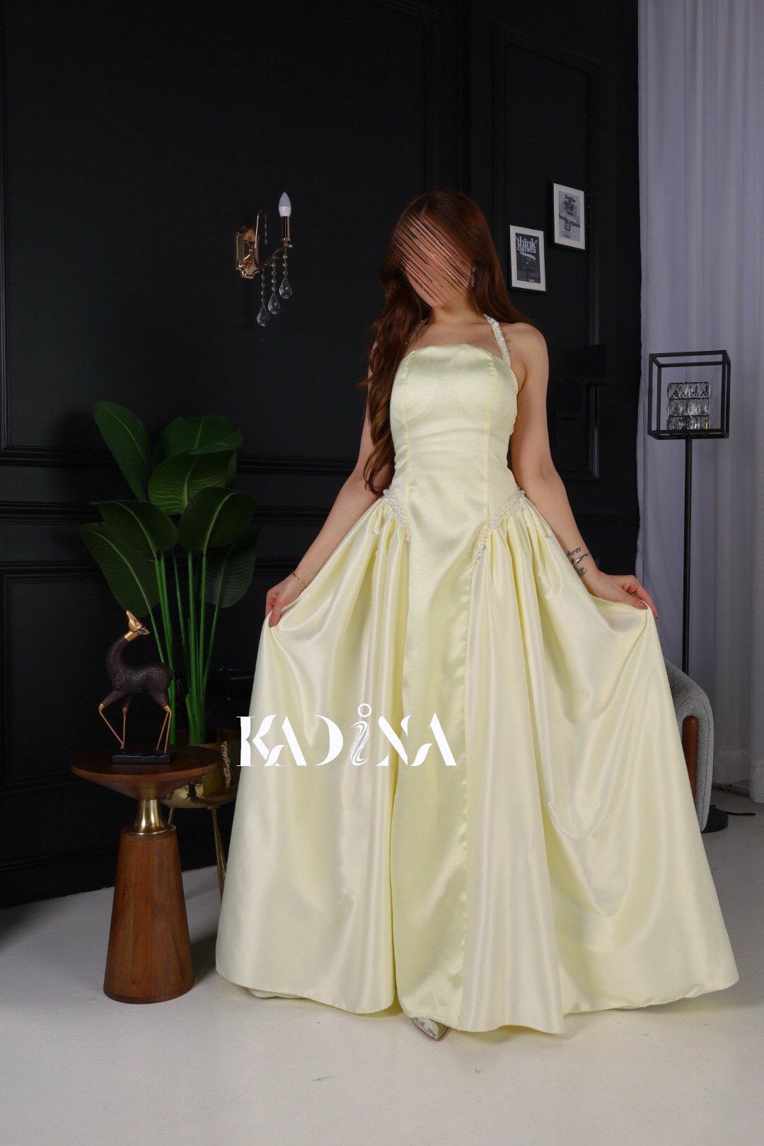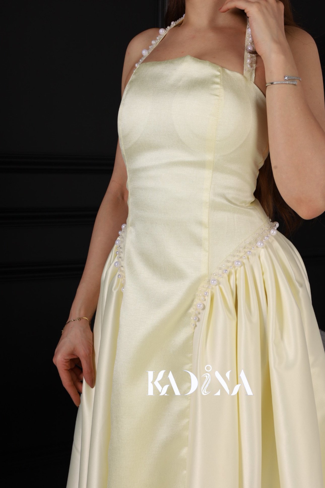 فستان اصفر ليموني مع لؤلؤ أنيق