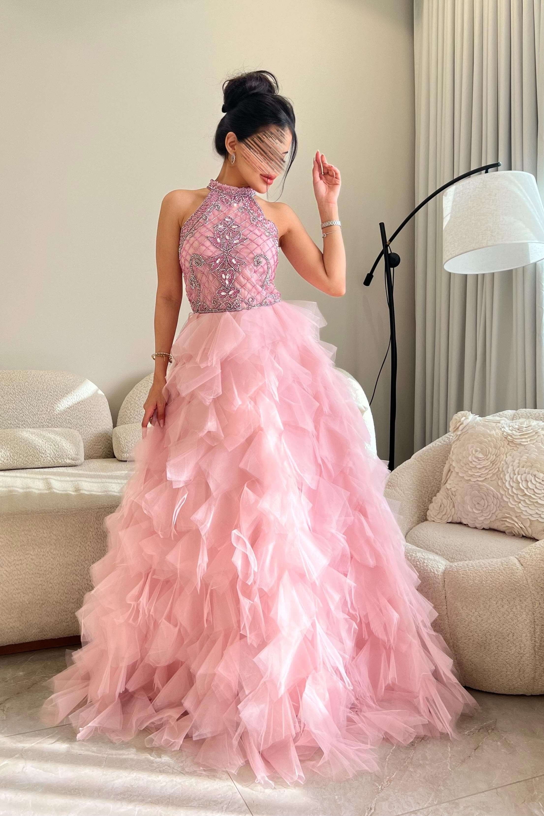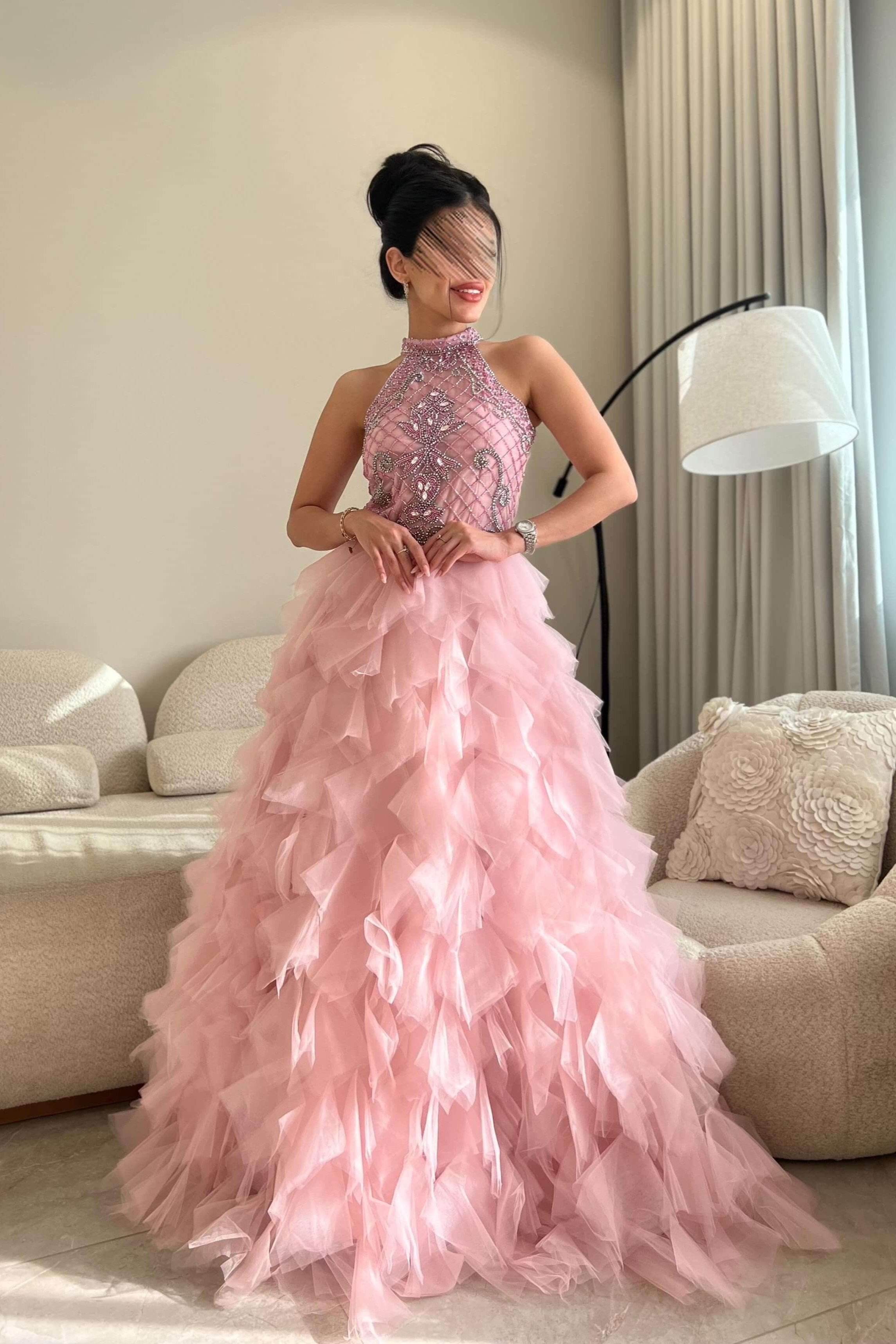 - وصف الفستان بدقة:اللون: وردي ناعم (Blush Pink) بطابع أنثوي وناعم.