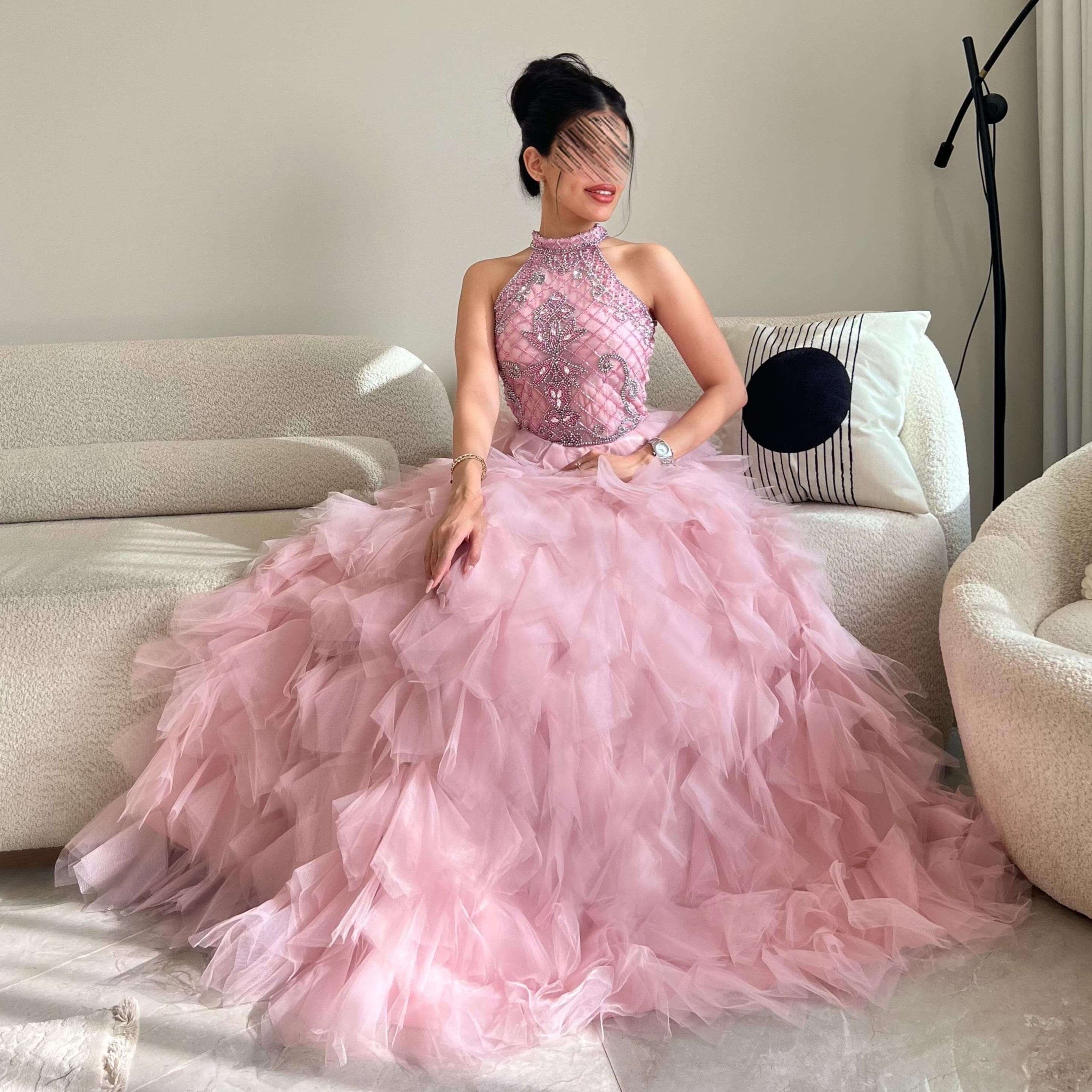 - الطبقات مقصوصة بطريقة غير منتظمة تُعطي الفستان حجماً وملمساً فريداً، وكأنها "ريش أو بتلات زهور".