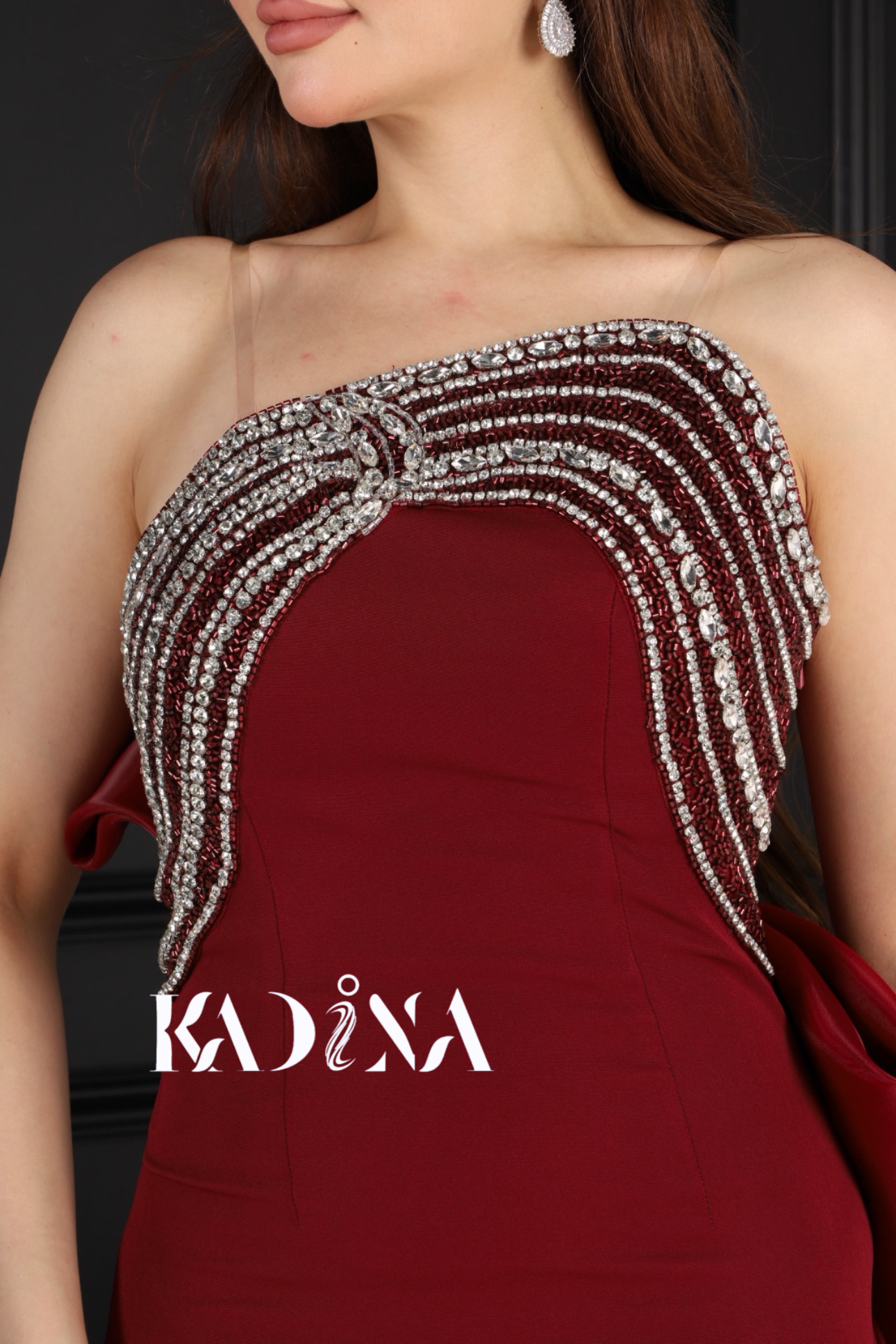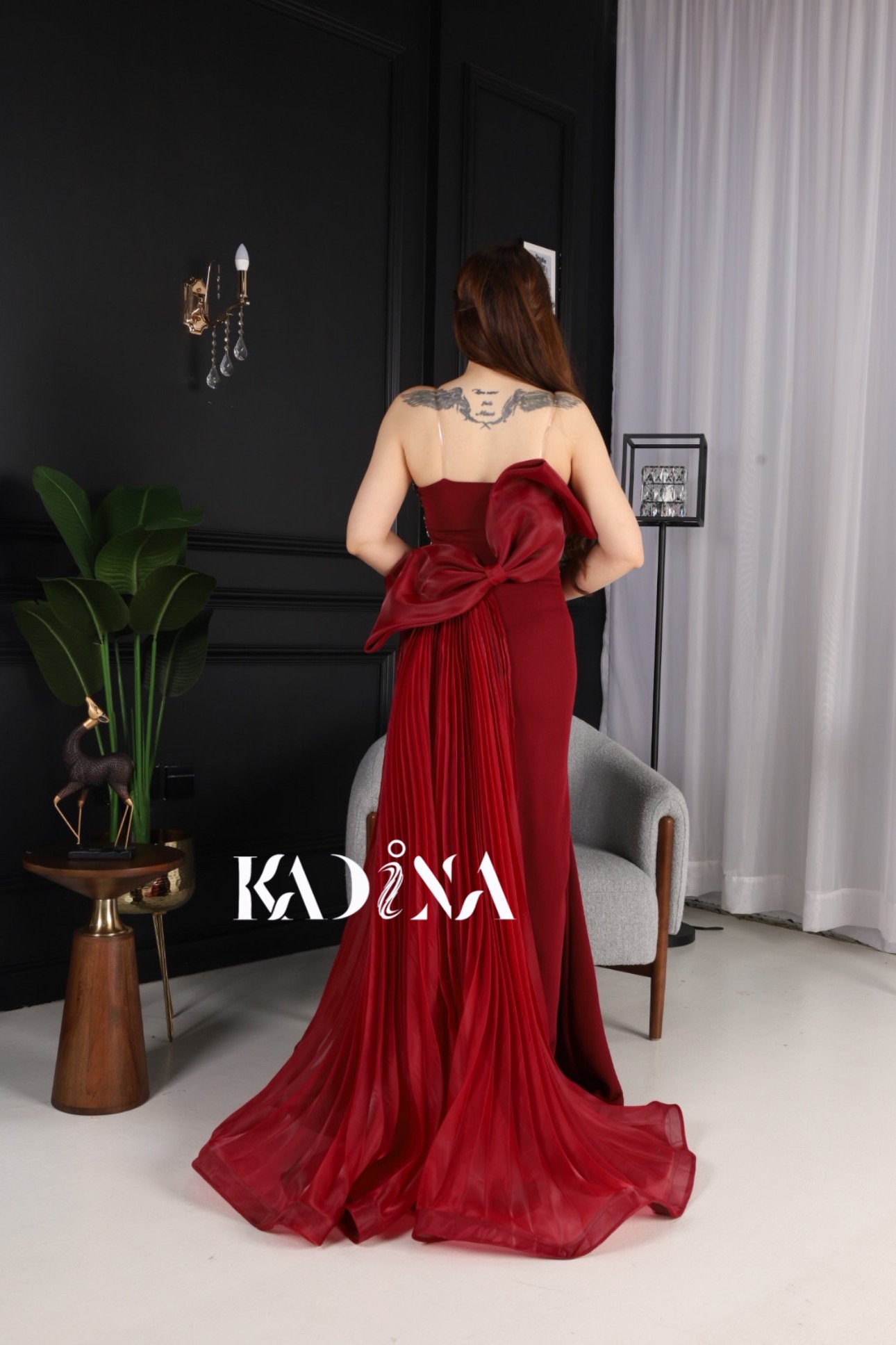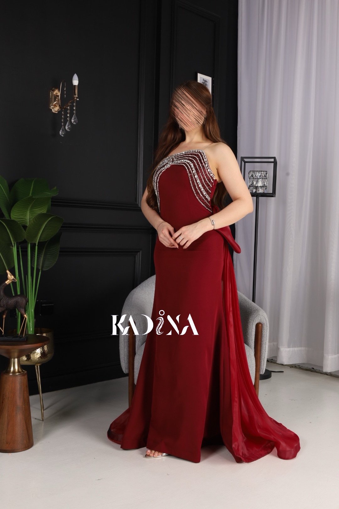 - القصة: فستان طويل وانسيابي بتصميم ضيق من الأعلى ويتسع تدريجياً نحو الأسفل بستايل ذيل السمكة، مما يبرز أنوثة القوام.