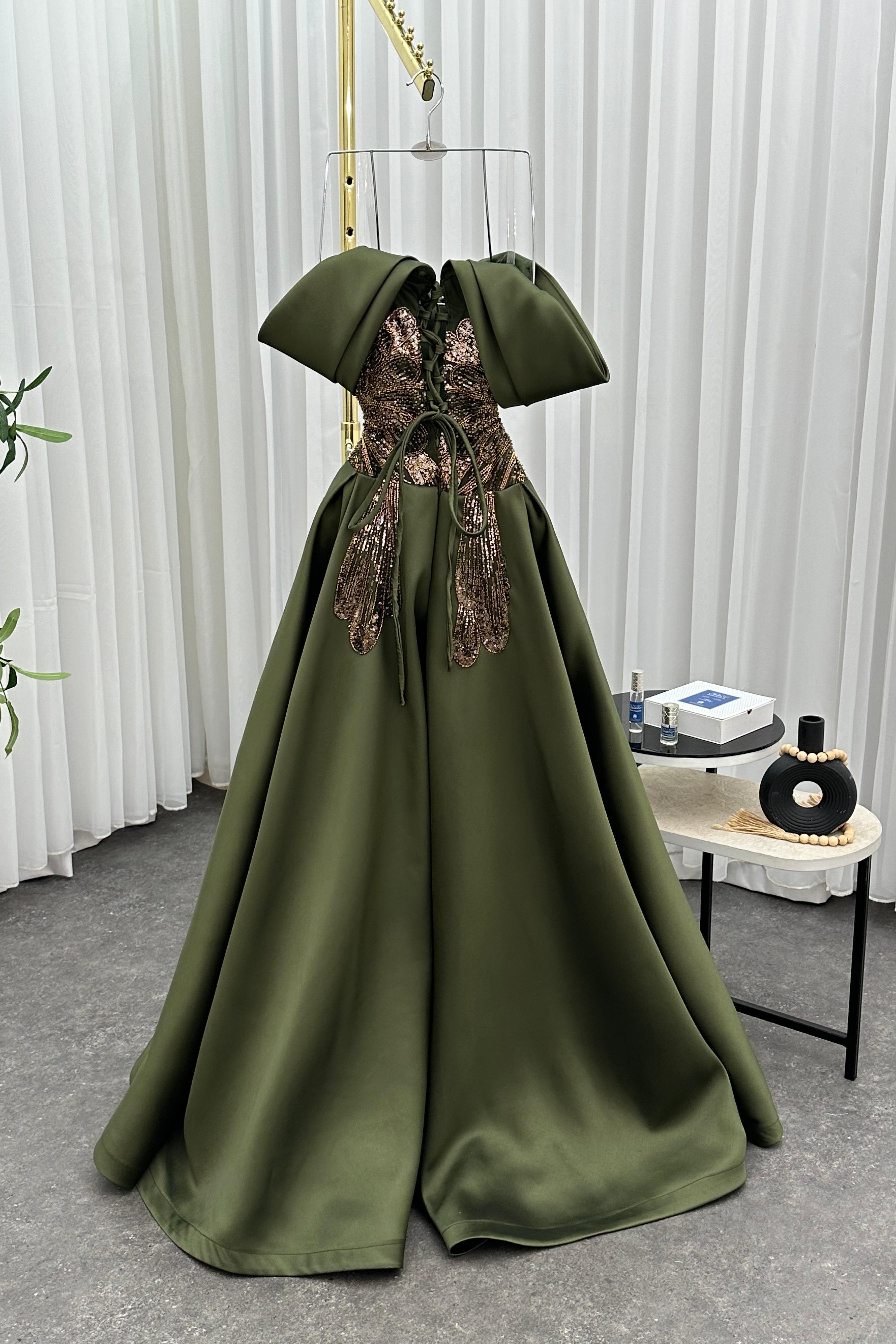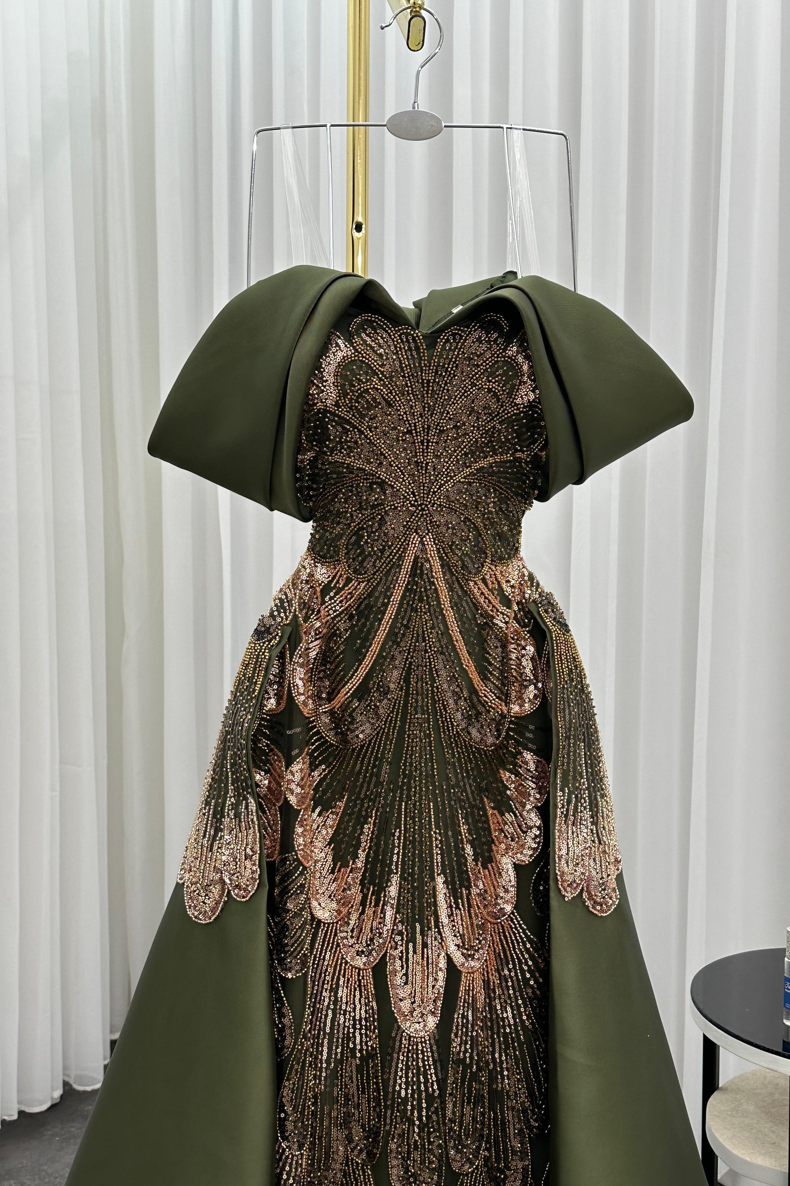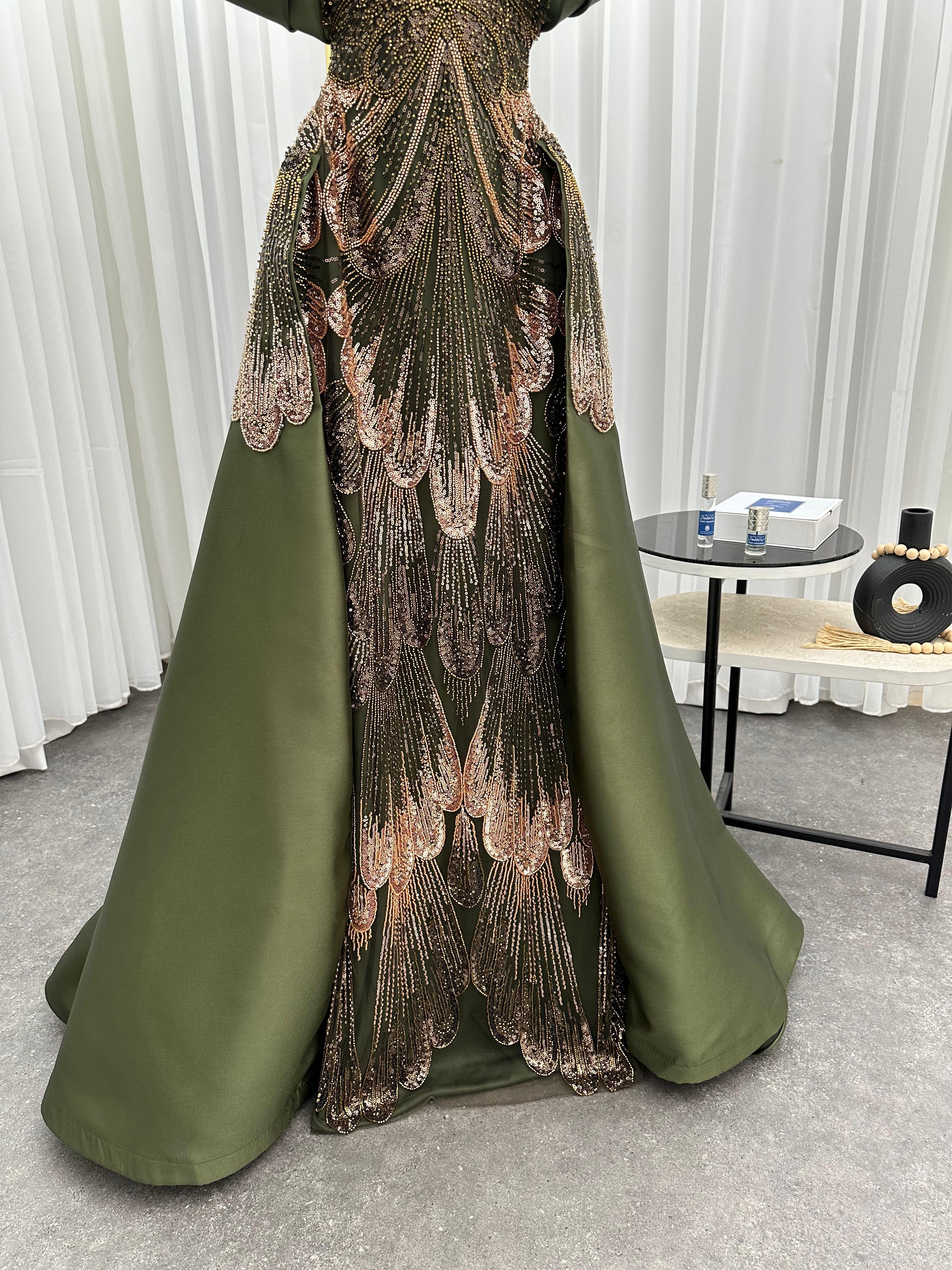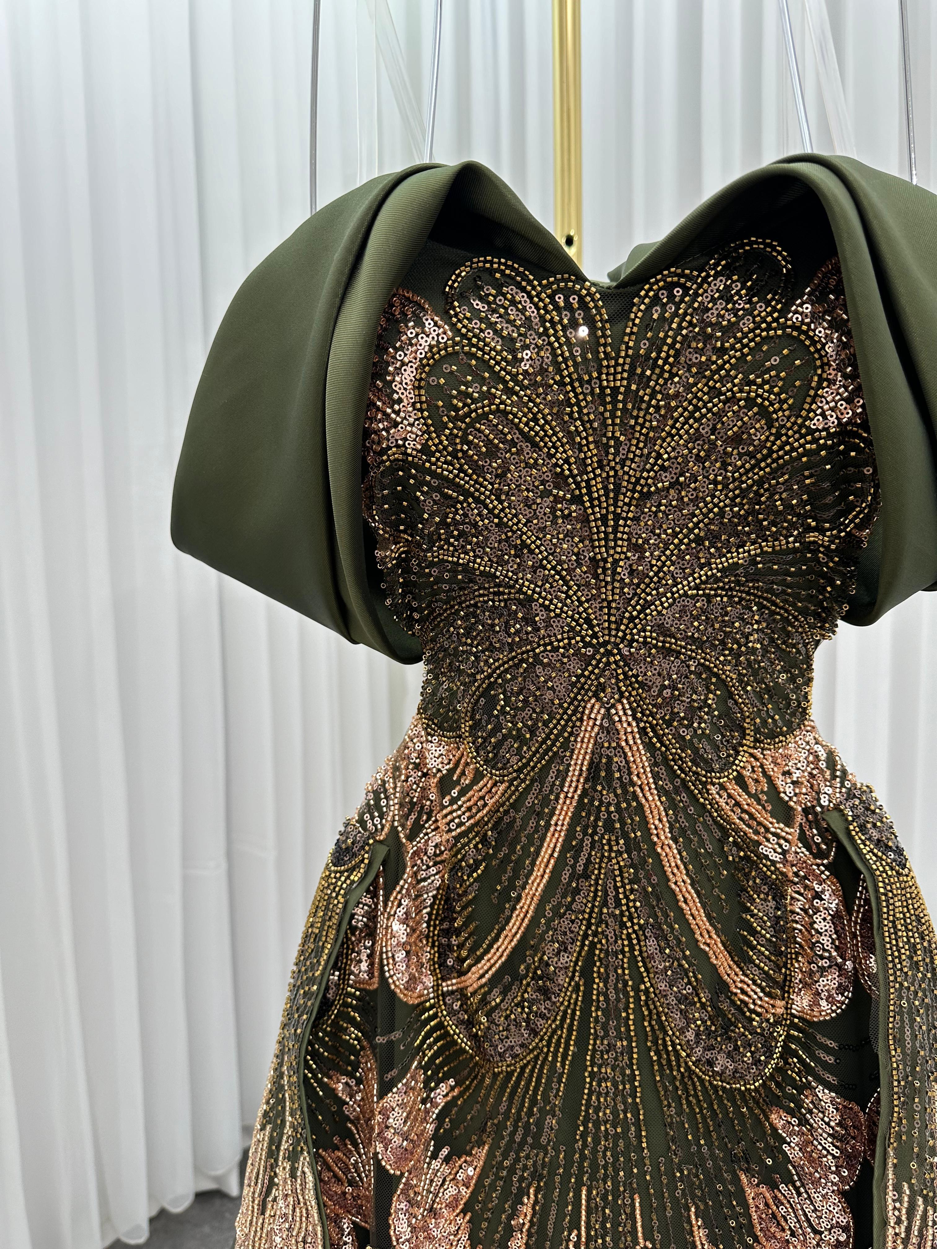 فستان أنيق وفاخر يتميز بلونه الأخضر الزيتوني العميق، يجمع بين الرقي والأنوثة. يتميز بقصّة ضيقة تبرز القوام، مع تفاصيل مطرزة ببريق ذهبي وبرونزي على كامل الجزء الأمامي، تضيف لمسة ملكية آسرة مستوحاة من الطراز الفينتاج الفاخر.