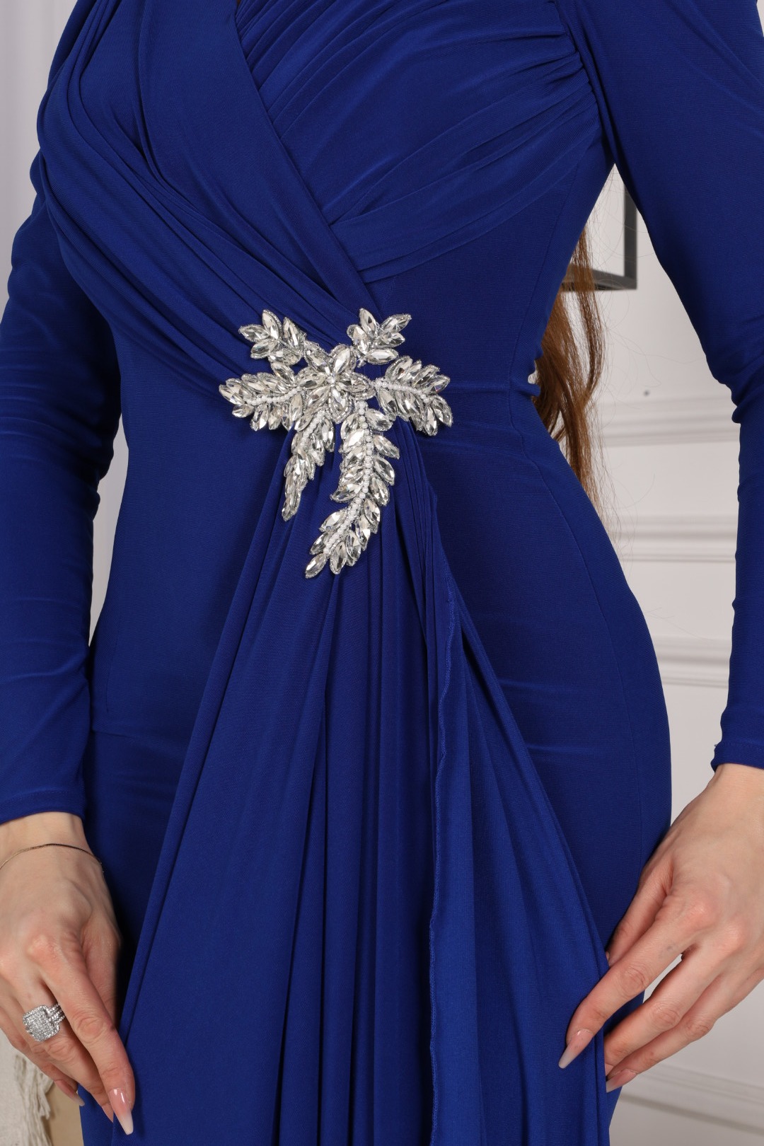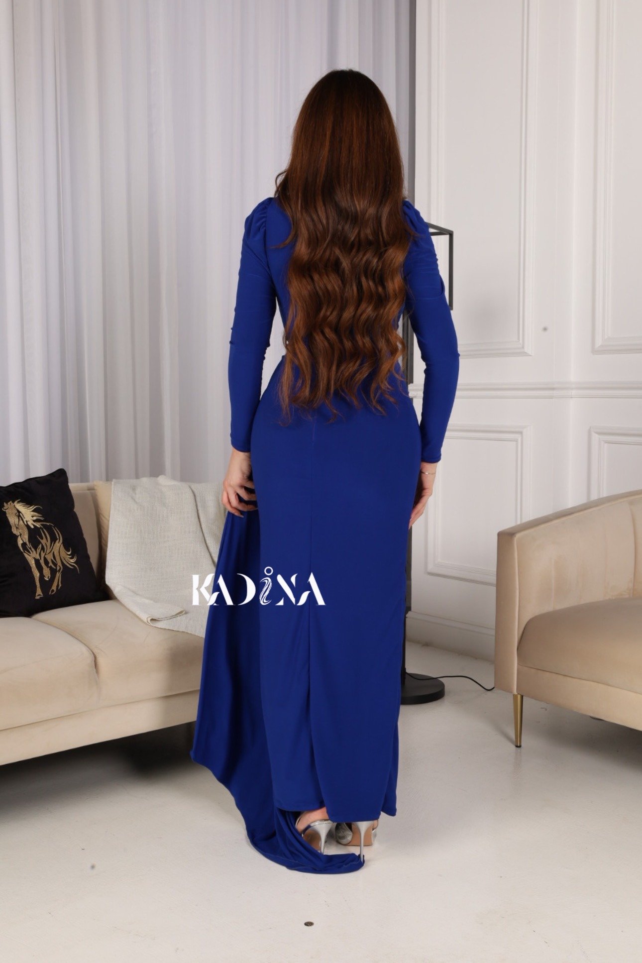 فستان سهرة طويل بلون أزرق ملكي فخم، يتميز بأكمام طويلة وقصة ضيقة عند الخصر تعزز جمال القوام. تصميم الصدر بشكل لفّ متقاطع يضيف لمسة راقية، مع طيات ناعمة تنسدل من الخصر . يزين الفستان بروش فضي لامع على الخصر، يمنحه لمسة فاخرة، بينما يضيف الشق الأمامي لمسة أنثوية وجاذبية راقية. القماش انسيابي وناعم، مثالي للمناسبات الرسمية والسهرات.