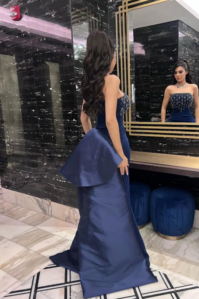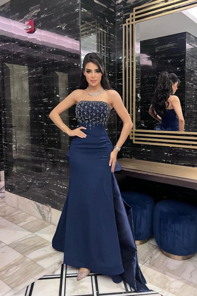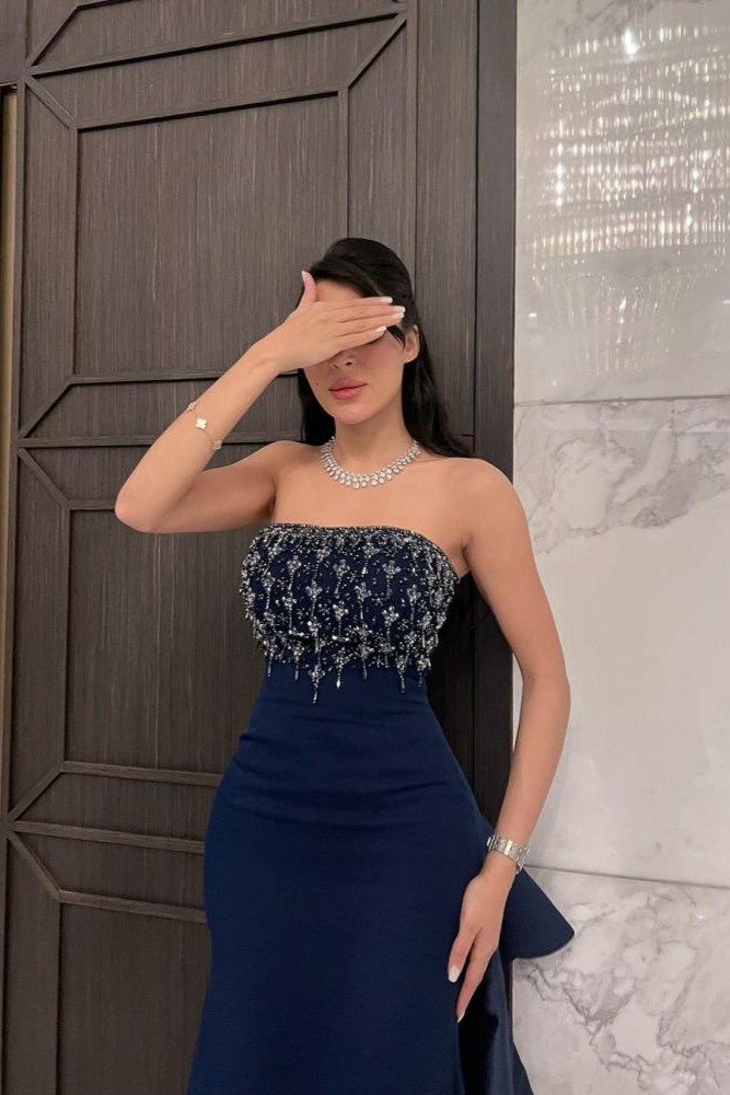 فستان كحلي ساحر يعكس أناقة لافتة، مزين بتفاصيلة الراقية وبقصة الصدر والخصر التي تضيف لمسة لامعة ومتألقة. إنه خيار راقٍ وجميل يضفي سحرًا فريدًا على إطلالتك، مثالي للظهور بأناقة في المناسبات المميزة