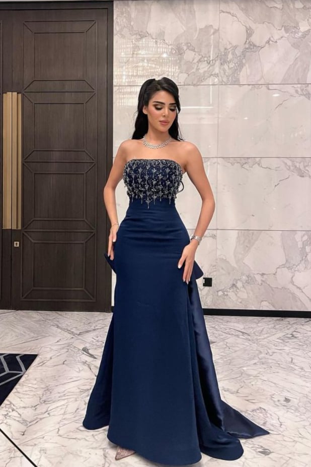 -فستان سهرة مزين بقصته الراقية وبشكلة الرئع والحديث بلإضافة إلى قصة الصدر المزينة بتطريز جذاب وتصميمه يجعله اكثر رقة و جاذبية