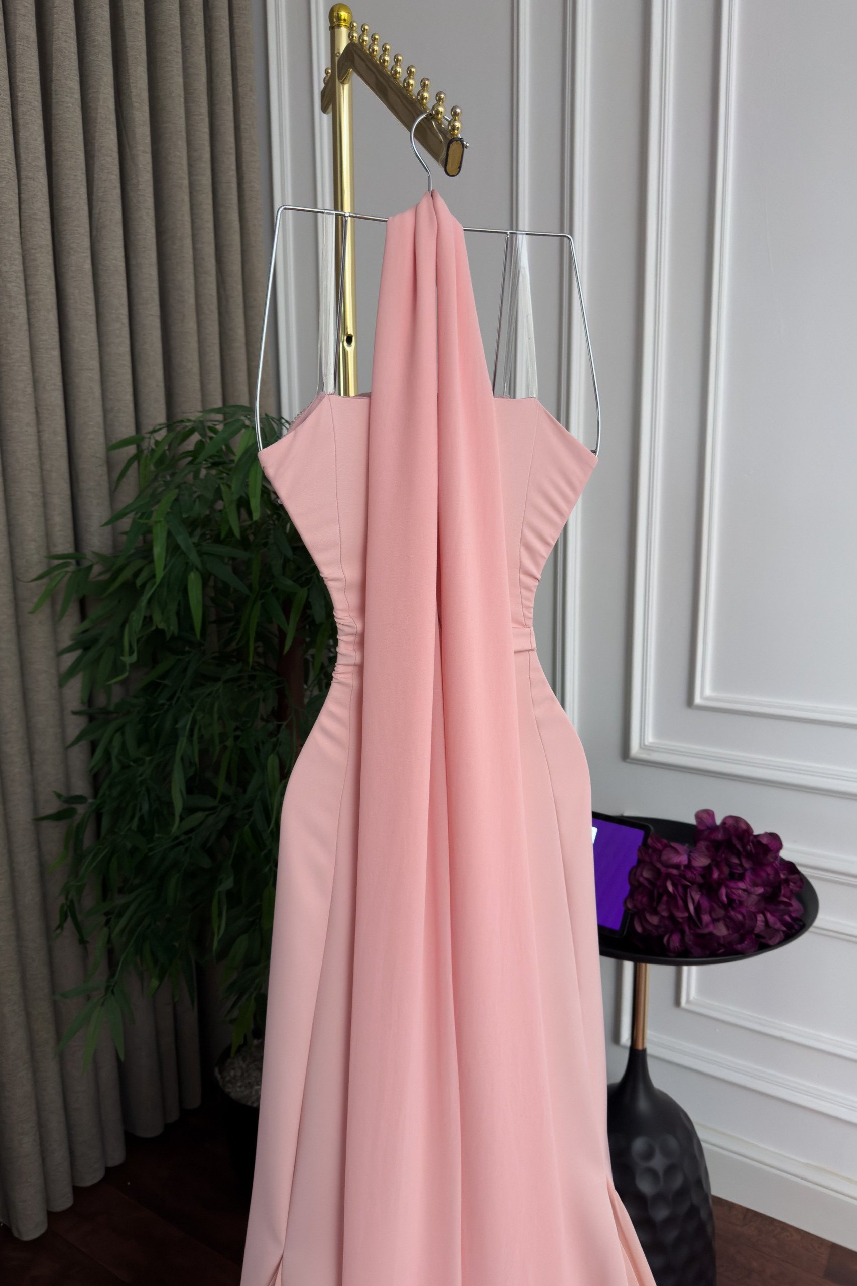 فستان أنثوي فخم باللون الوردي الفاتح، بتصميم راقٍ يجمع بين البساطة والرقي. يأتي بقصّة مستقيمة تنساب برقة على القوام مع ذيل خفيف يضفي لمسة من الأناقة الملكية. يتميز الجزء العلوي بتصميم بدون أكتاف يبرز الأكتاف والرقبة بأنوثة لافتة، مزين بتطريز متقن على شكل نقوش متداخلة من الخرز اللامع والترتر الوردي الذي يعكس الضوء بخفة. القماش المستخدم من الحرير الشيفون أو الكريب الناعم مما يمنحه انسيابية وأناقة مثالية للمناسبات الفاخرة أو حفلات المساء.