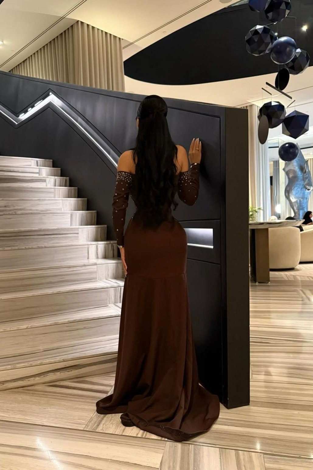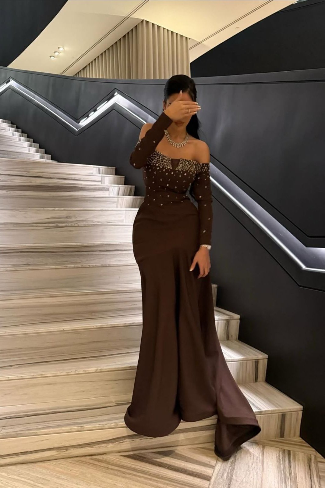فستان سهرة فاخر باللون البني الداكن بتصميم أوف شولدر أنيق يبرز جمال الكتفين والرقبة. يتميز الصدر بتطريز يدوي فاخر مرصع بحبات كريستال لامعة تضيف لمسة بريق راقية. يأتي الفستان بقصة ضيقة من الأعلى لتحديد الخصر مع أكمام طويلة تزيد من فخامته، ثم يتسع تدريجيًا من الأسفل بقصة ذيل السمكة لتمنح إطلالة ملوكية جذابة. الخامة المستخدمة ناعمة ومتماسكة لتبرز الشكل الانسيابي للجسم، مما يجعله خيارًا مثاليًا للمناسبات الراقية والاحتفالات المسائية.